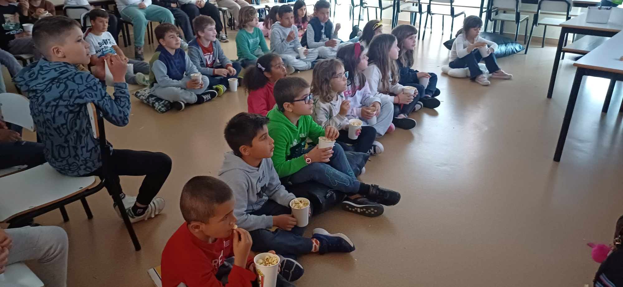 Seguiu-se uma sessão de cinema, que transformou a escola numa sala de projeção, criando um ambiente de lazer partilhado entre turmas e professores.